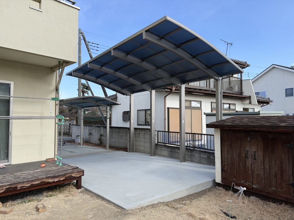 群馬県伊勢崎市S様邸 カーポート・物置施工 群馬県伊勢崎市のS様邸にて、カーポートと物置の施工を行いました。お車を雨や紫外線から守るカーポートに加え、屋外収納として便利な物置を設置することで、毎日の暮らしやすさを高めた外構工事です。土間コン...
